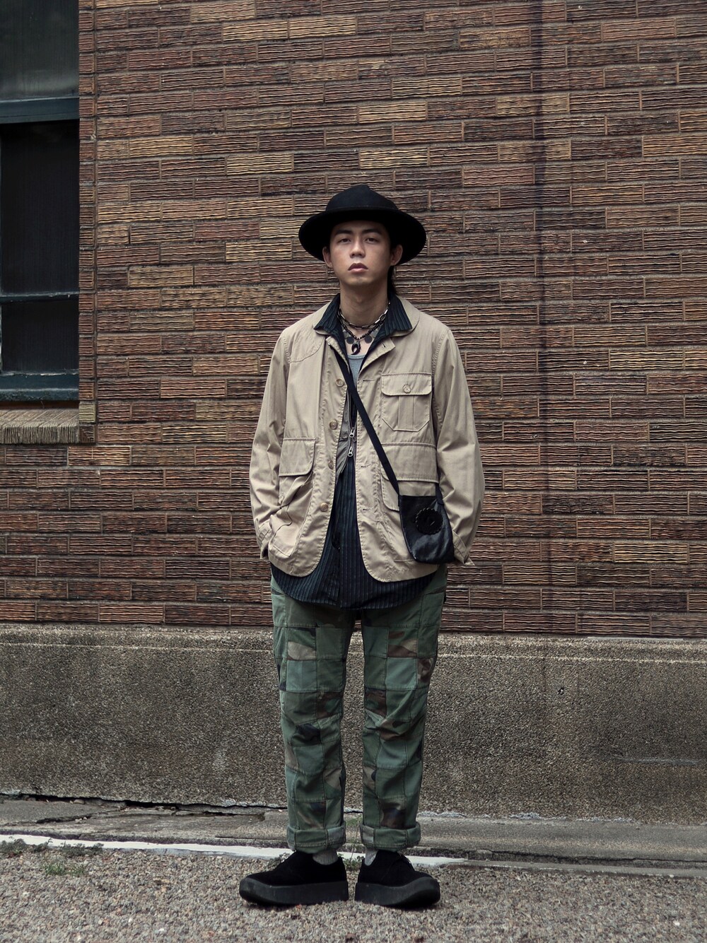 Instagram: onuswc Youtube : 家庭兄弟 Familybros 這套內搭、襯衫、外套疊加, 在頸部和下擺處做出層次, 整體是上微寬長下合短比例, 色調上以黑與綠上下呼應, 加上迷彩拼接當作重點。 感謝大家收看!