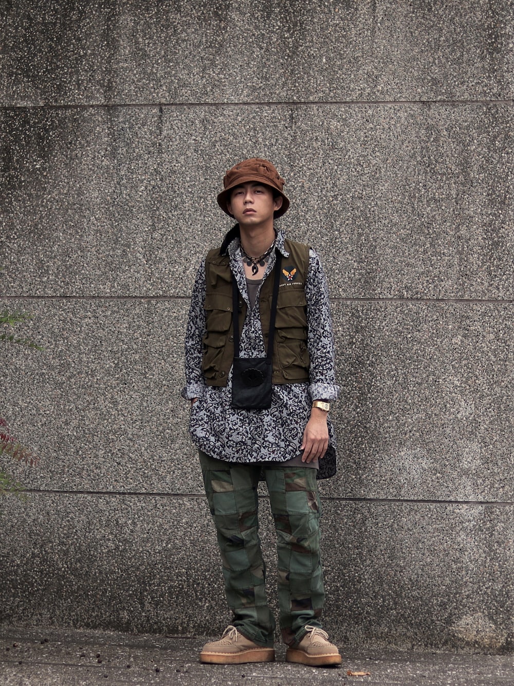 Instagram: onuswc Youtube : 家庭兄弟 Familybros 這套長襯衫、內搭、背心層疊, 背心和襯衫下擺長度差, 在頸部露出內搭都做出層次感, 整體做出上合長下微寬的輪廓, 並且上下兩種圖騰讓視覺更加豐富。 感謝大家收看!