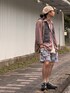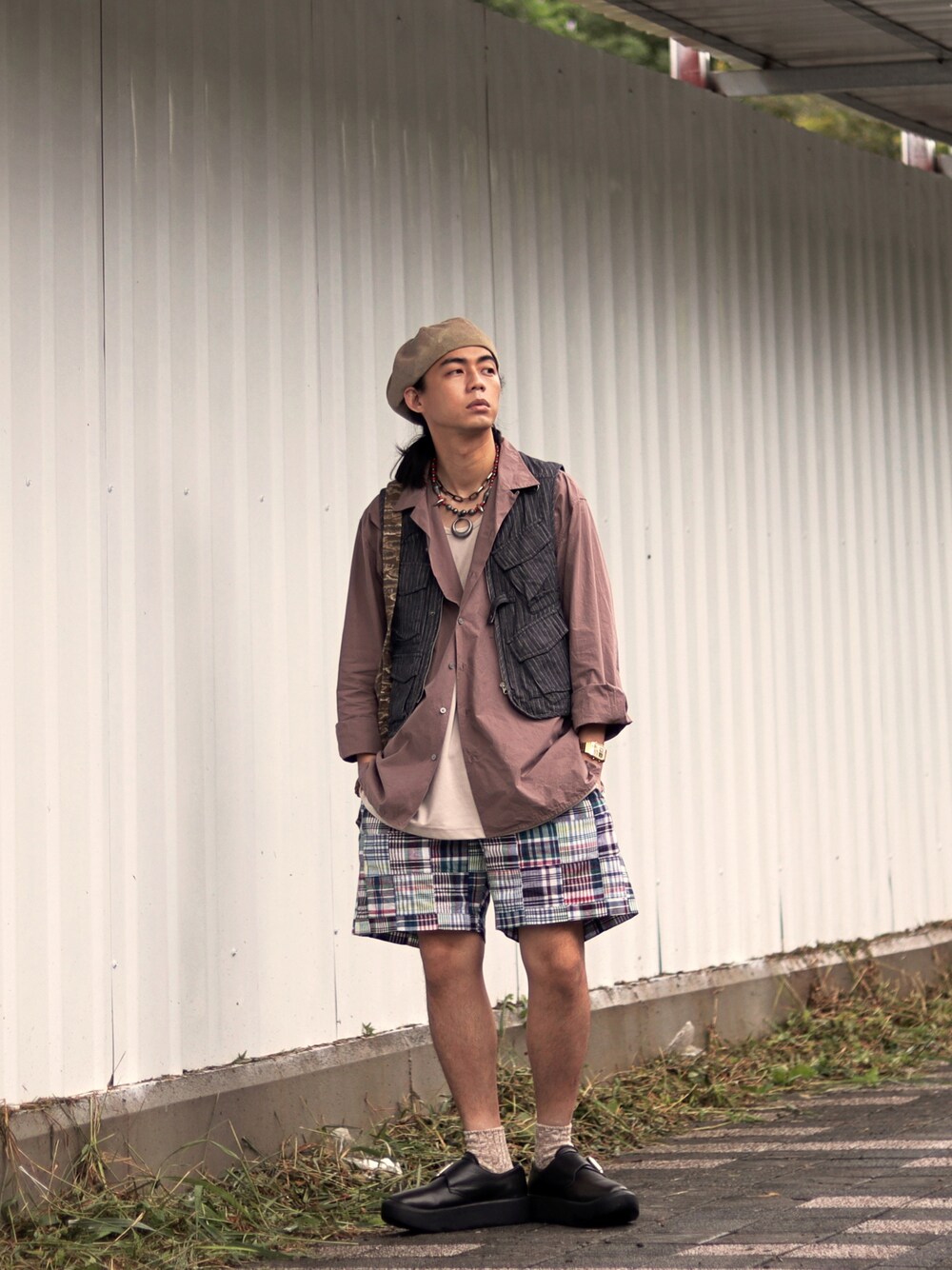 Instagram: onuswc Youtube : 家庭兄弟 Familybros 這套襯衫、內搭、背心疊加, 打開露出內搭讓頸部和下擺有層次, 整體做上寬長下寬短的比例, 色系上以暗紫色與短褲上的紅做呼應, 並以百家布格紋圖騰來當作整體的重點。 感謝大家收看!