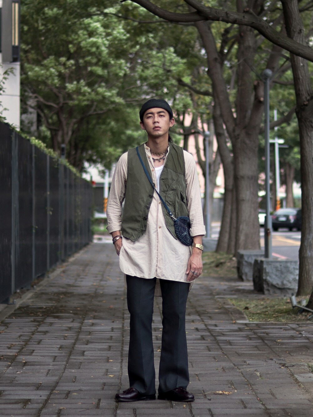 Instagram: onuswc Youtube : 家庭兄弟 Familybros 這套長襯衫、內搭、背心組合, 在頸部和下擺長度做出層次, 整體呈現上合長下合短的比例, 並以小包裝飾點綴一下。 感謝大家收看!