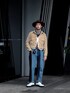 Instagram: onuswc Youtube : 家庭兄弟 Familybros 這套上身高領、襯衫、背心、外套疊加, 在頸部和身體處做出層次, 上衣紮入褲頭拉長腿部比例, 以藍、棕、白三色組合呼應協調