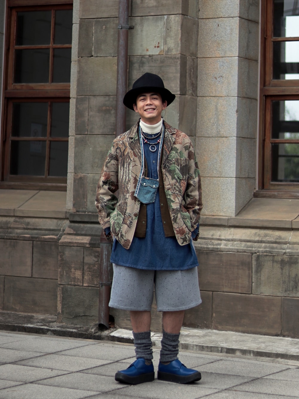 Instagram: onuswc Youtube : 家庭兄弟 Familybros 這套長襯衫、高領、外套領頸部層次, 襯衫、開襟衫、外套下擺處層次, 與寬五分褲做上寬下寬輪廓, 顏色上較飽和的藍色上下呼應更增加協調。 感謝大家收看!