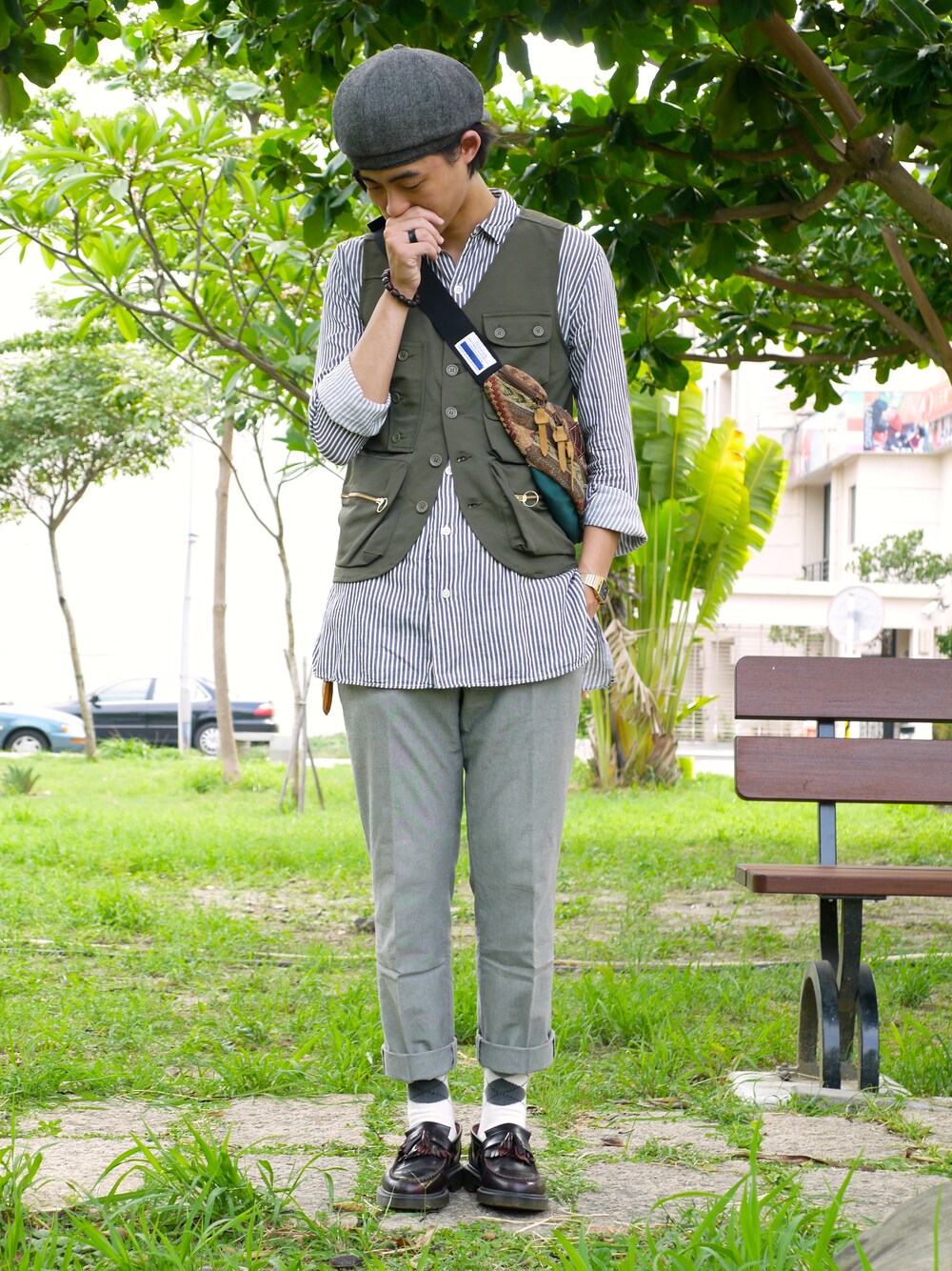 這套在襯衫外面加件背心露出下擺增加層次, 捲袖子涼快些也讓上身更俐落一點, 下身合身燙線灰色西褲與帽子顏色呼應, 捲褲管露出襪子增加些腳部層次, 民俗風圖紋腰包和襪子花紋讓整體豐富度更多~ 感謝各位收看我們下次見~ Dappei: http://dappei.com/photos/47736 Facebook: https://www.facebook.com/wwwfamilybroscom Website: http://familybros.com/