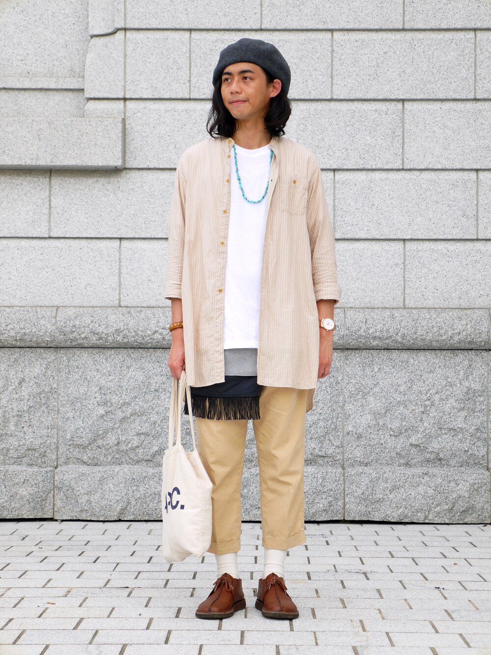 因為玫瑰金所以我們以淺色和卡其色的搭配來當作情侶裝, 上身在白色素T、灰色內搭、米色長襯衫做個層次, 腰間流蘇飾布讓腰部做出由淺而深的漸層, 顏色上淺卡其九分褲露出的白襪與上身白T, 以及淺卡其和玫瑰金做同色調的呼應,最後在領口的綠松石項鍊裝點一下~ Instagram: https://www.instagram.com/onuswc/ Facebook: https://www.facebook.com/wwwfamilybroscom Website: http://familybros.com/ Dappei: http://dappei.com/user/familybros