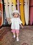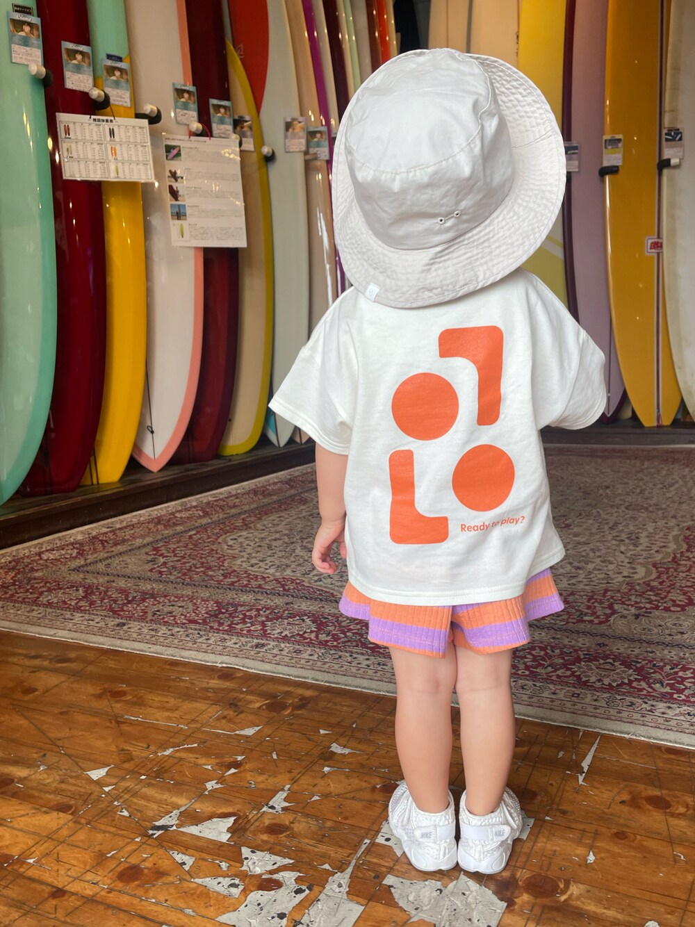身長:84cm 着用サイズ: 1 ビビットカラーのグラフィックプリントTシャツにバイカラーのショーツを合わせてみました! 夏っぽくて可愛いコーディネートです!