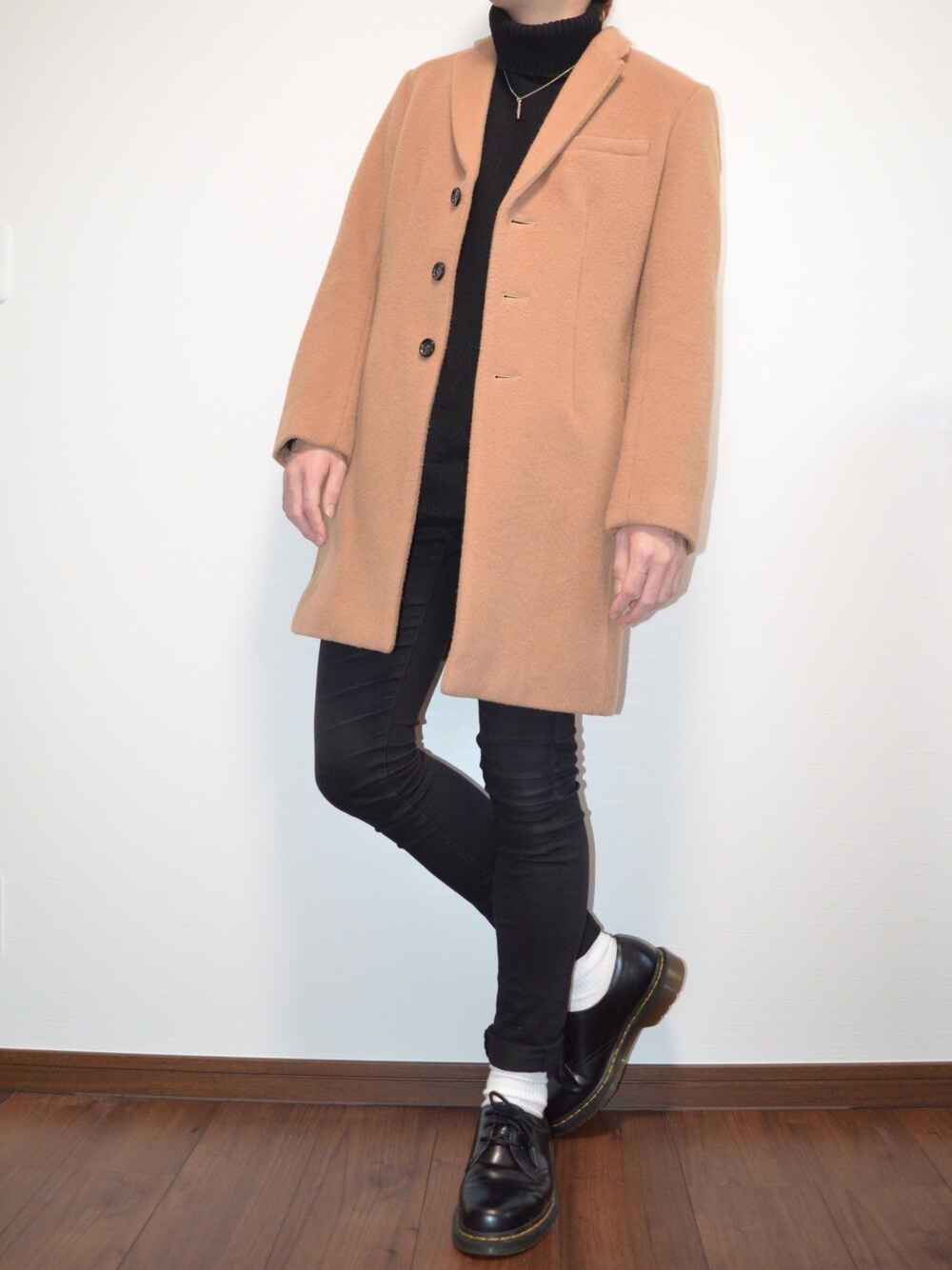 チェスターコートコーデ✨ 今回はインナーを黒で揃えてベージュのチェスターコートを着てみました😋 アウターとインナーをLui'sのあいてむなので質感も良くお気に入りです😊