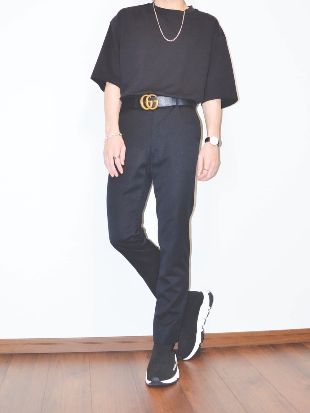 オールブラックコーデ✨ 今回はシンプルに真っ黒でGUCCIのベルトで合わせてみました😋 オールブラックにベルト、シルバーのアクセサリーがいい感じにマッチしてまとまってますね😚