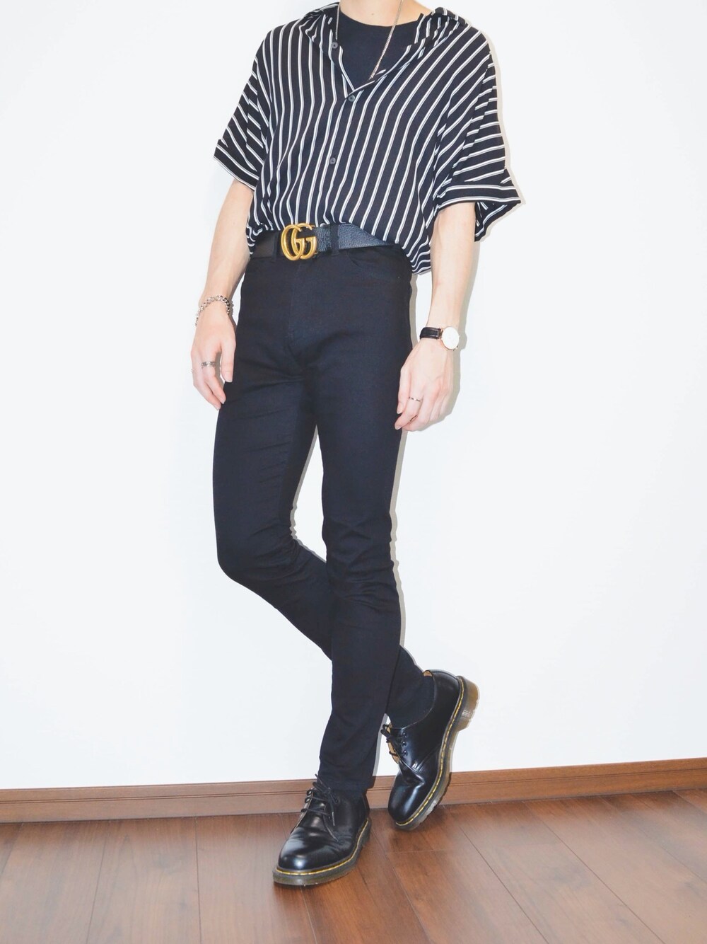 ストライプシャツコーデ✨ 今回はストライプシャツにタックインし黒で統一してスタイルを良く見せることを意識しました😁 夏はシンプルになりがちなのでタックインで他と差別化を意識!😊