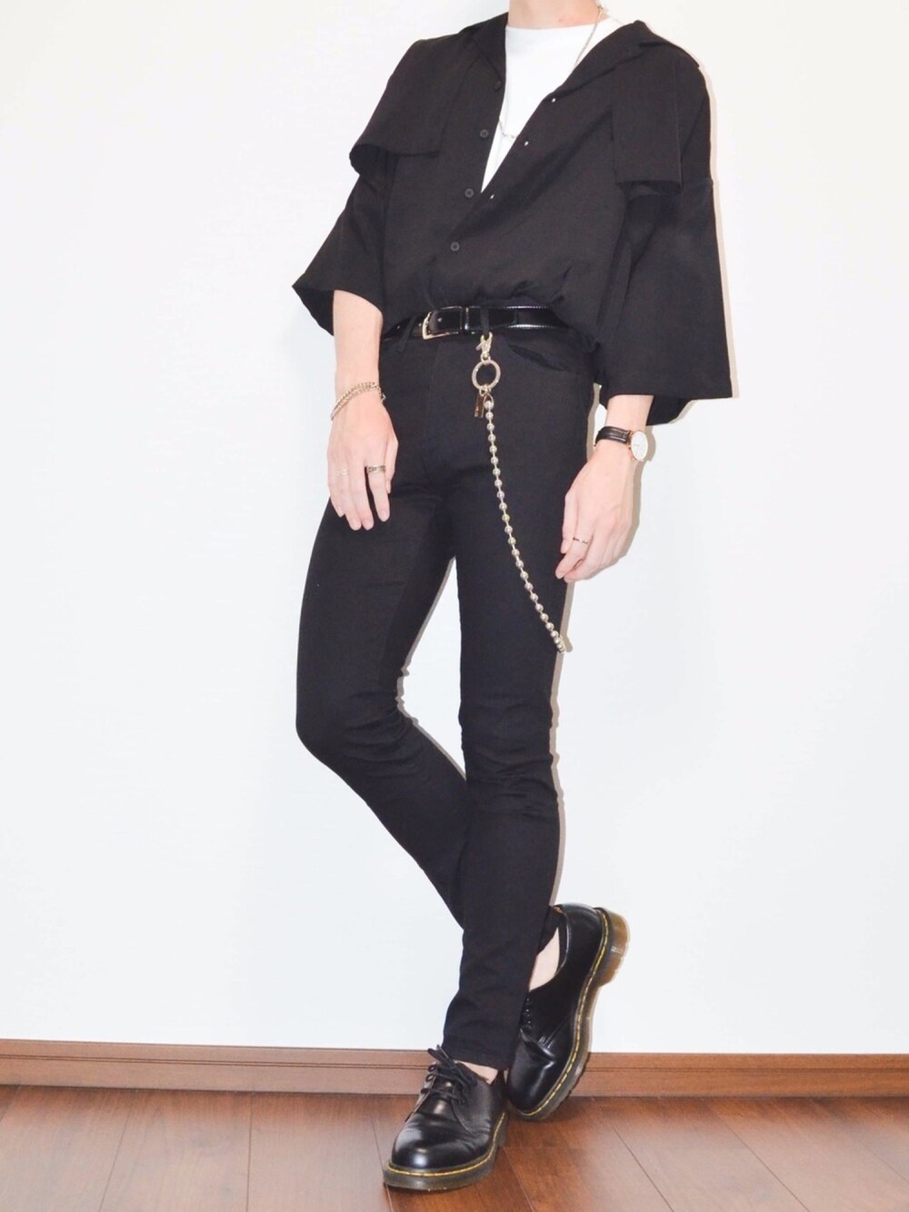 オールブラックコーデ✨ 今回は個人的に良くやるお気に入りの組み合わせでシンプルに組んでみました😋 シャツのタックインは前開けて白Tを見せ、黒スキニーでスタイル向上を意識してみました🤗