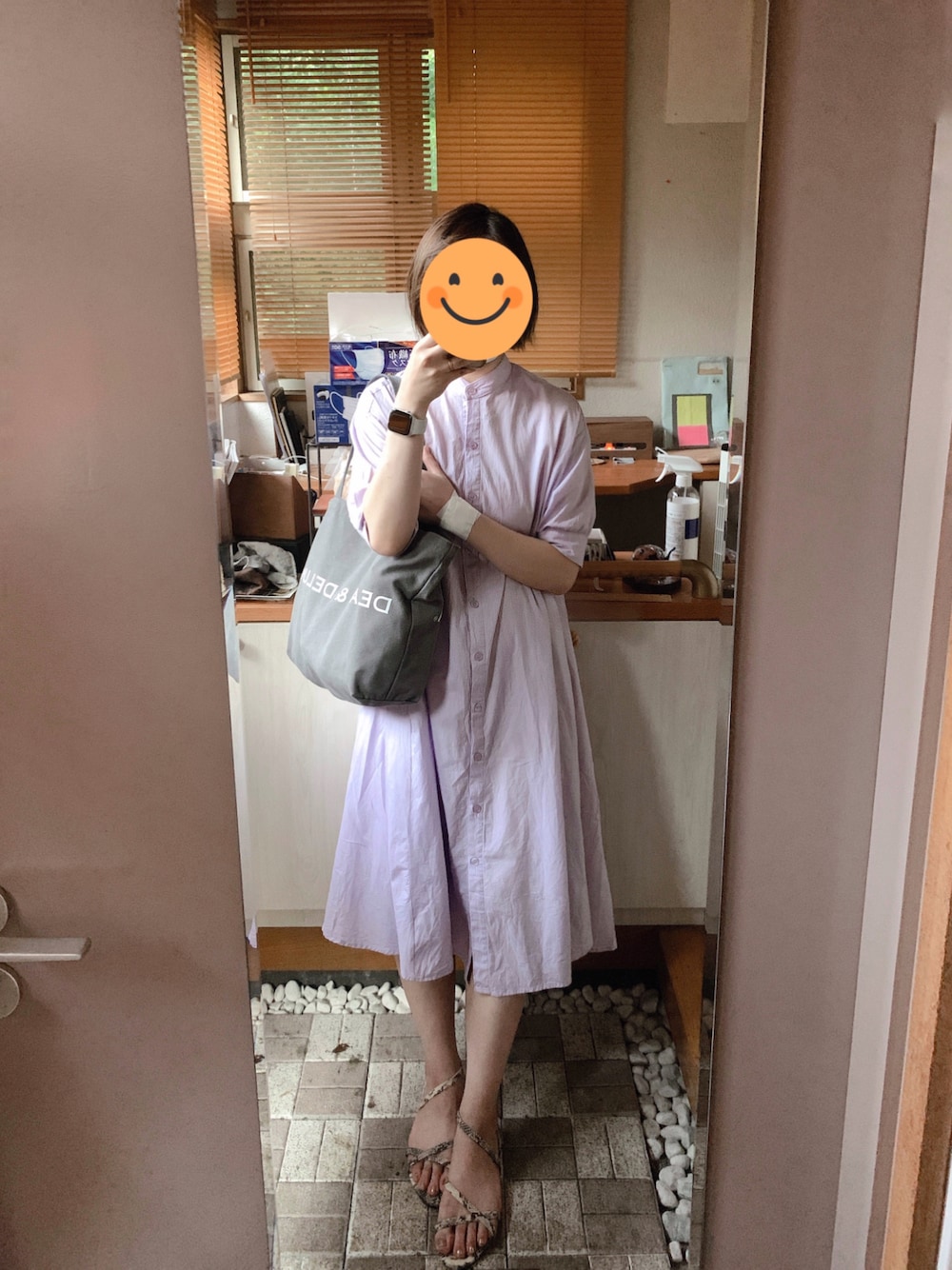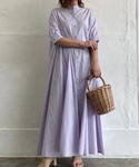 M☺︎のシャツワンピース「バンドカラーシャツ フレアロングワンピース」を使ったコーディネート