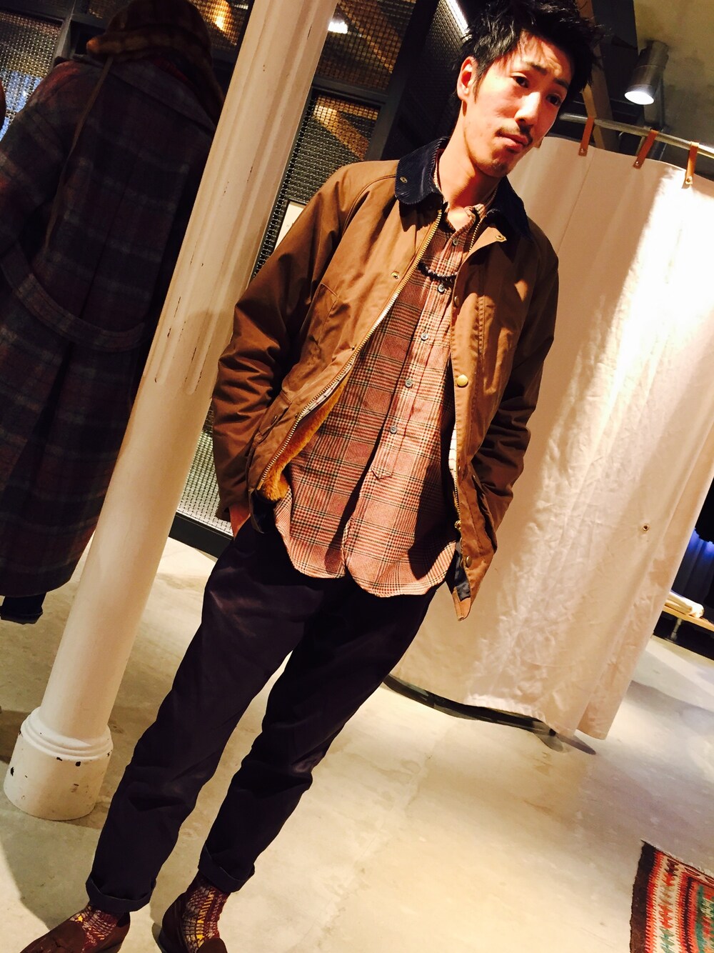 バブアーコーデ。 アウター バブアー シャツ エンジニアドガーメンツ パンツ サンカ ソックス アンティパスト ネックレス フローリアン シューズ ジャコメッティ