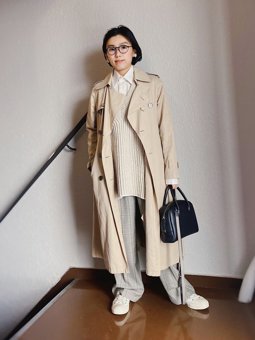 トレンチコートで春気分 といってもまだ寒いので 厚手のニットベストを。 ニュアンスをだすために 同系色でまとめました。 instagram