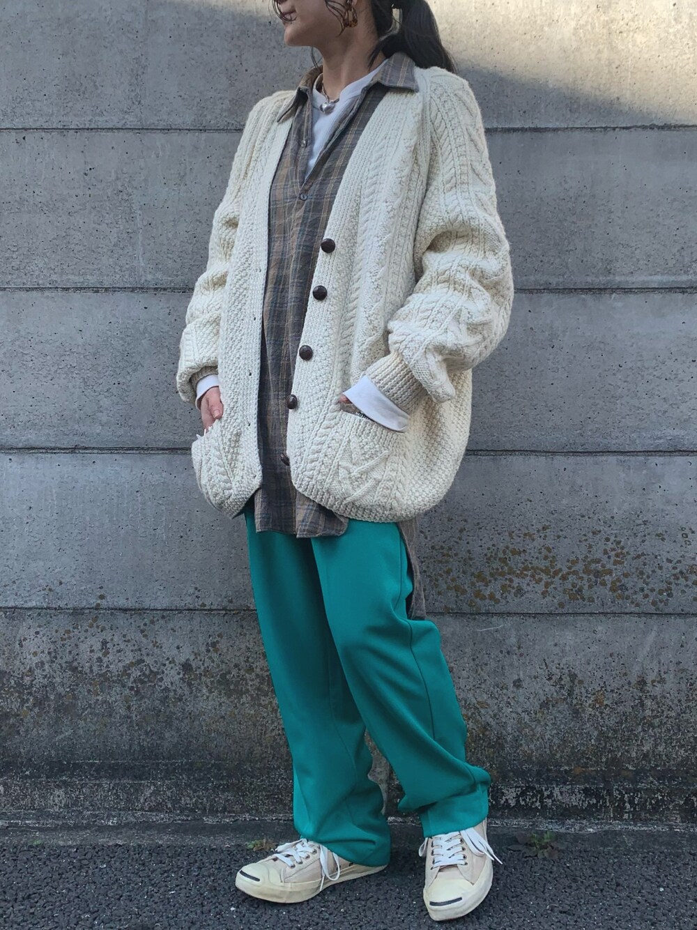 後ろが長いグランパ👔 もうすぐ着れなくなる前に アウターでフィッシャーマンを🧶 パンツで差し色入れたので靴は大人しめに👟