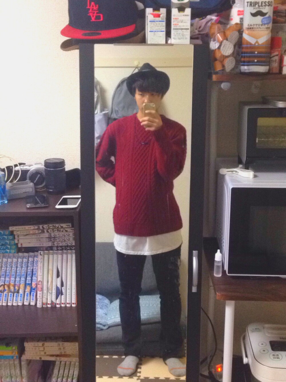 んー赤ニットをどう着こなそうかと思ってみたんですけど、これはどうですかね…