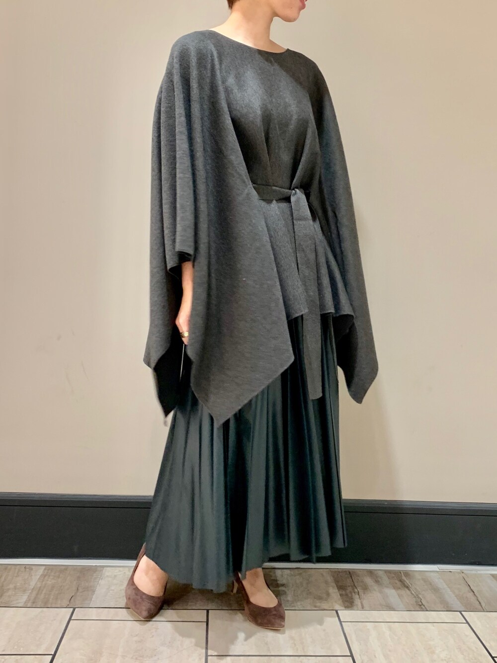 【9/13(日)本日ZOZO¥2.000クーポン実施中❤️】 閲覧頂きありがとうございます😊 ゆるっとしたポンチョ×プリーツスカート×ヒールを合わせた、SALONらしいリラックス&エレガンスなコーディネート✨ ポンチョはウエストをマークできるので、メリハリのあるゆるコーデを楽しめます! フェイクレザーのプリーツスカートは、ご自宅でも洗えて嬉しいです🥳