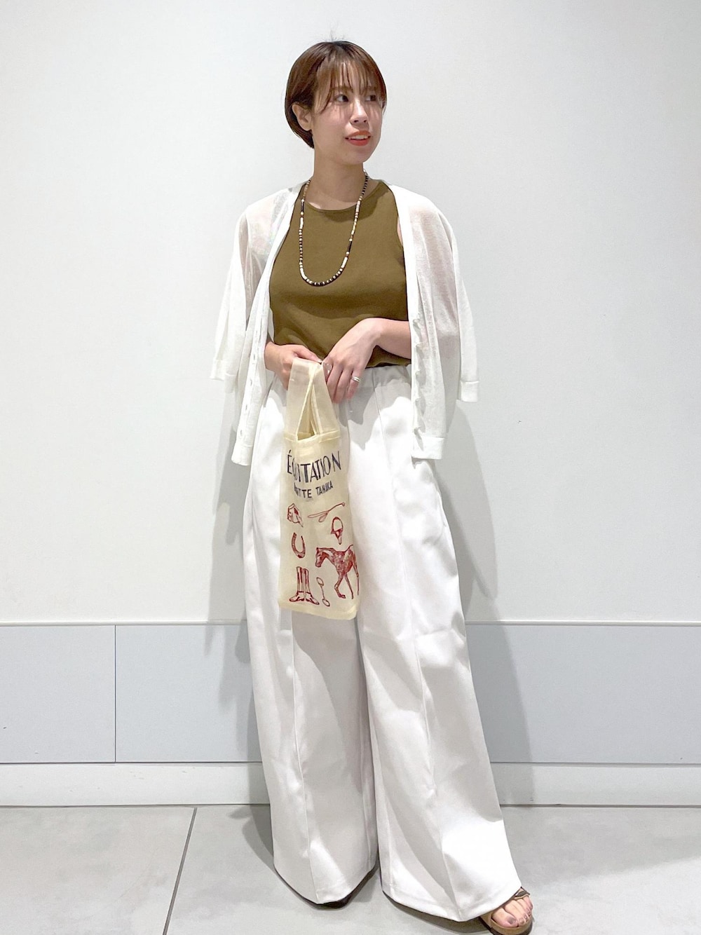 BRIGITTE TANAKA×SALONのベージュのトートバッグを合わせたかったスタイリング* ベージュ×白のワントーンで、バッグが引き立つように。 カジュアルになりすぎないよう、程良く大人っぽくトートバッグを持ってお出かけしたいという方におすすめです。 necklace SBZ54150 ¥9,240 pants/COGTHEBIGSMOKE SBS54180 ¥39,600