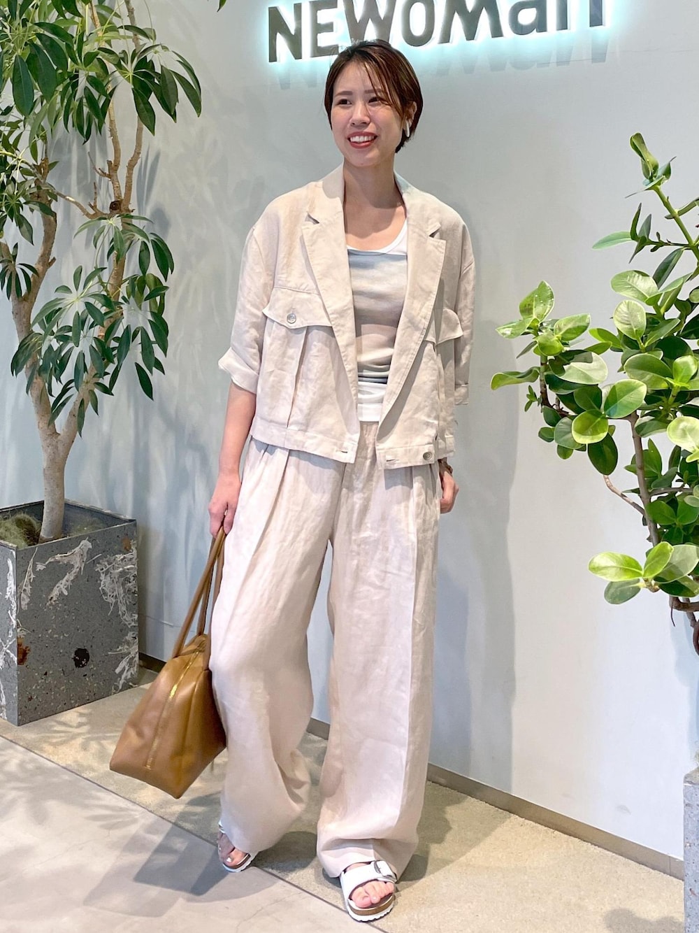 あれこれ着るのも暑くて面倒くさい!っていう夏にぴったりなリネンのセットアップが入荷しています。 ゆったりと涼しく着られるのに、上下で合わせるだけでオシャレ度が上がります◎ ベージュのセットアップなので、小物もクリーンでナチュラルな色合わせで大人っぽく。