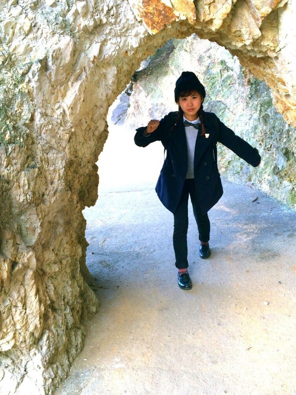 岩をくぐる! ○コート E hyphen world gallery ○ベスト w closet ○白シャツ 黒スキニー UNIQLO ○靴下 チュチュアンナ ○帽子 earth music&ecology