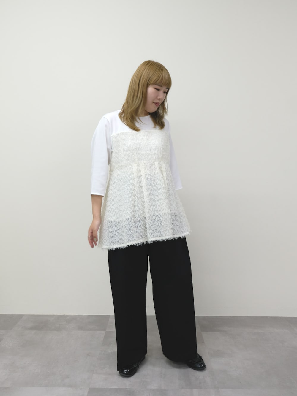 DOLLUPOOPS_TEVALT(DOLLUPOOPS_TEVALT)のTシャツ/カットソー「フリンジジャガードビスチェレイヤードライクトップス」を使ったコーディネート