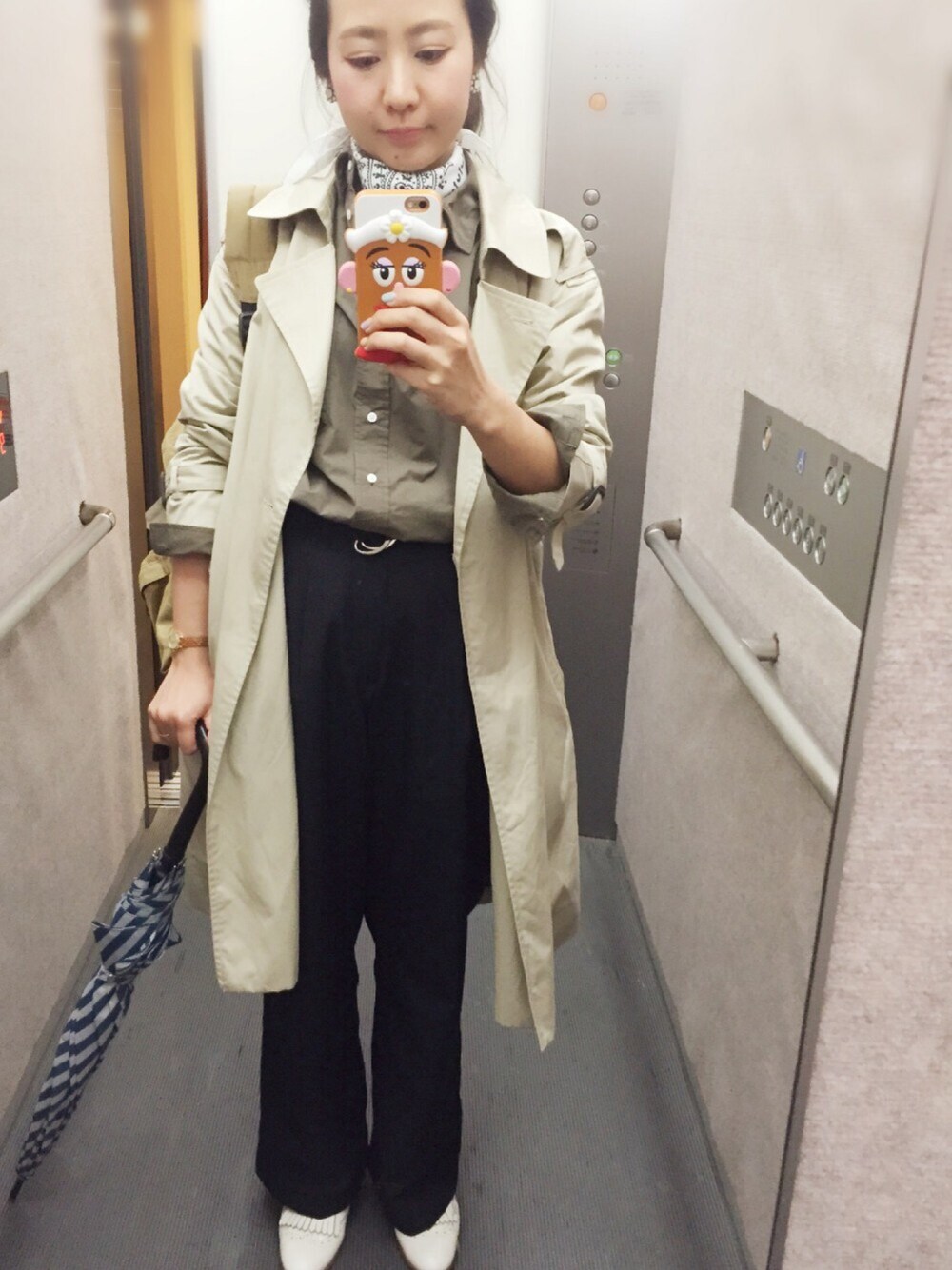 3/9 久しぶりにカーキのシャツ来ました😆 首元に 今お気に入りの シルクバンダナ巻き巻きしたら なんかジャングルクルーズに出てきそーな感じに仕上がった笑 なんか上着と傘が中のコーデと しっくりきてない気がするけど、 ま、いーか😚 それより manipuriのシルクバンダナの白と radaのお花イヤリングの白との組み合わせが かわゆいです♡♡♡ 春は この組み合わせが ちょいちょい登場するかもです 😅😚😆✨