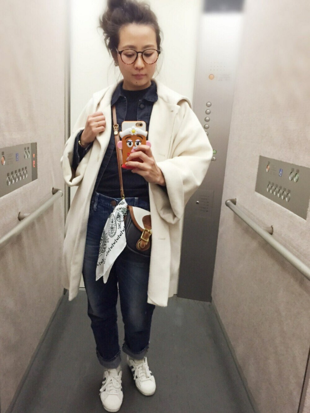 ネイビーのトップスとデニムを合わせるコーデ好きです♡ ネイビー×ホワイト😚 今日は、スカーフ ポシェットに巻きました⭐️ 夜は 中学の時の友人と飲み会🍻