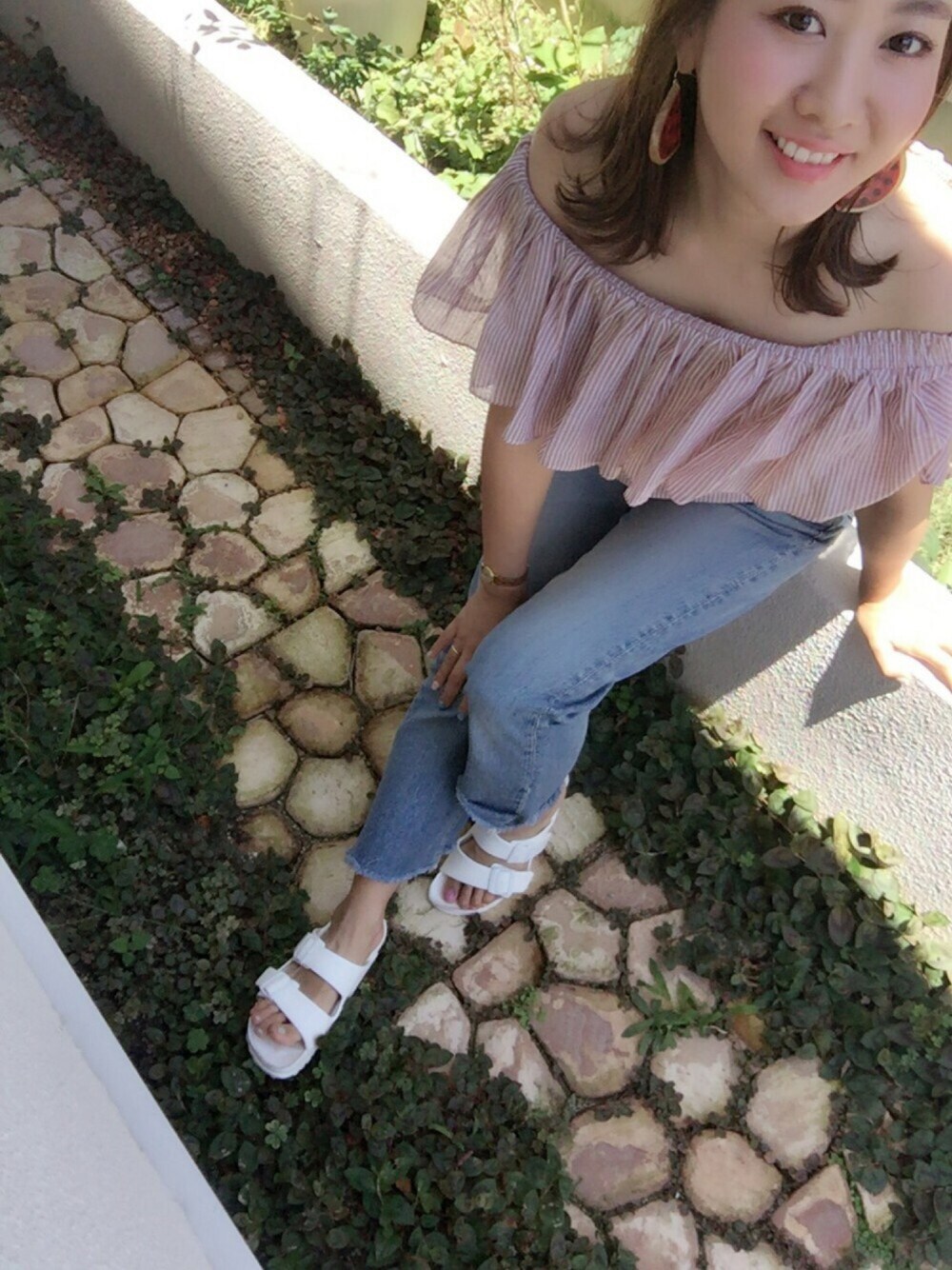 7/20 夏休み 🍉🍉ちゃんデビュー😚✨ 赤いストライプ柄のオフショルに合わせて すいか🍉🍉のピアスを つけました✨