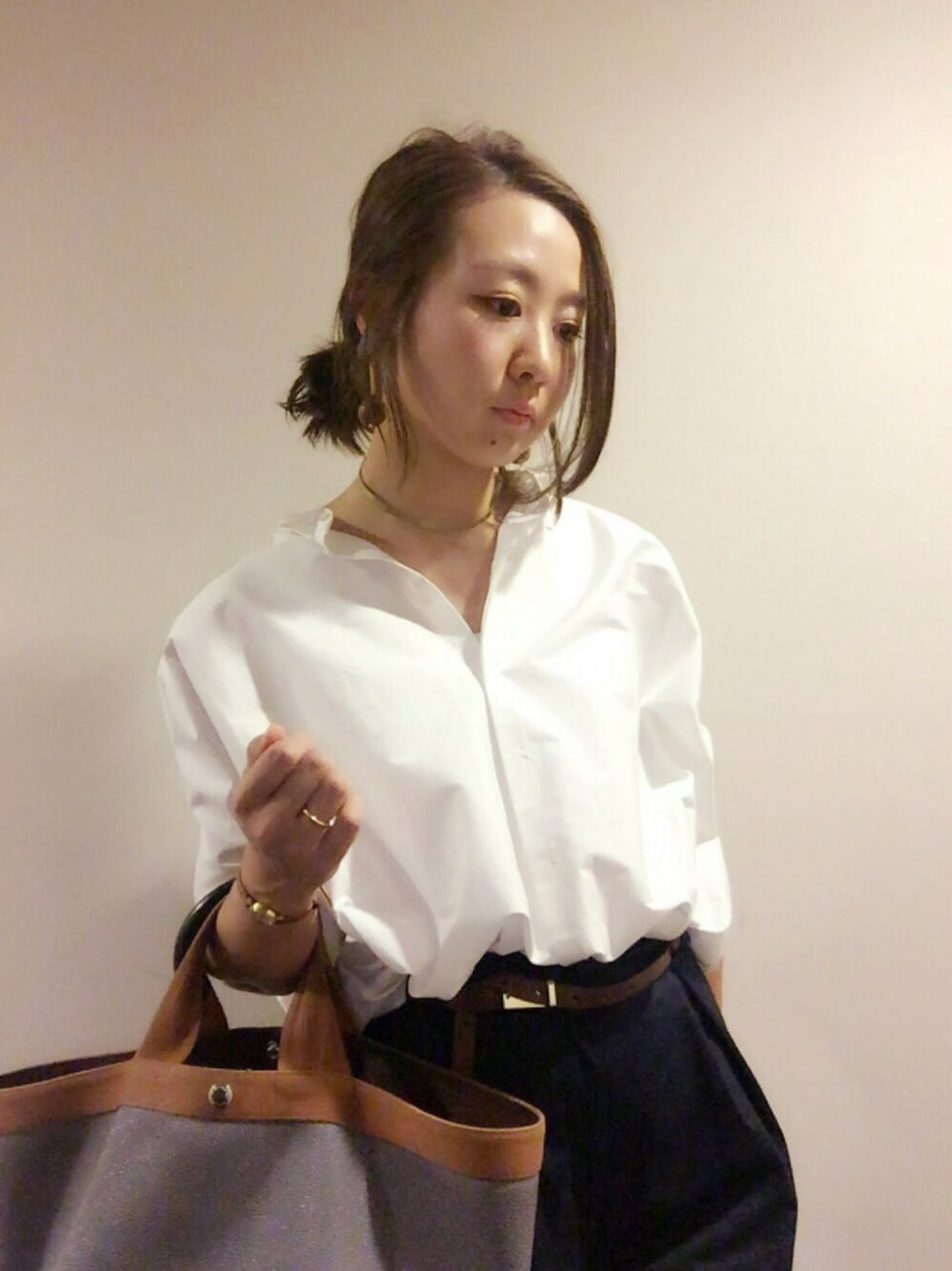 仕事のコーディネートで 困ったら… やっぱりきちんと感のある 白シャツを着る😚 白シャツは白シャツでも デザインがたくさん 定番もいーけど、 今日は、 襟がコンパクトで ドロップショルダーで 少しひねりのあるシャツ♡