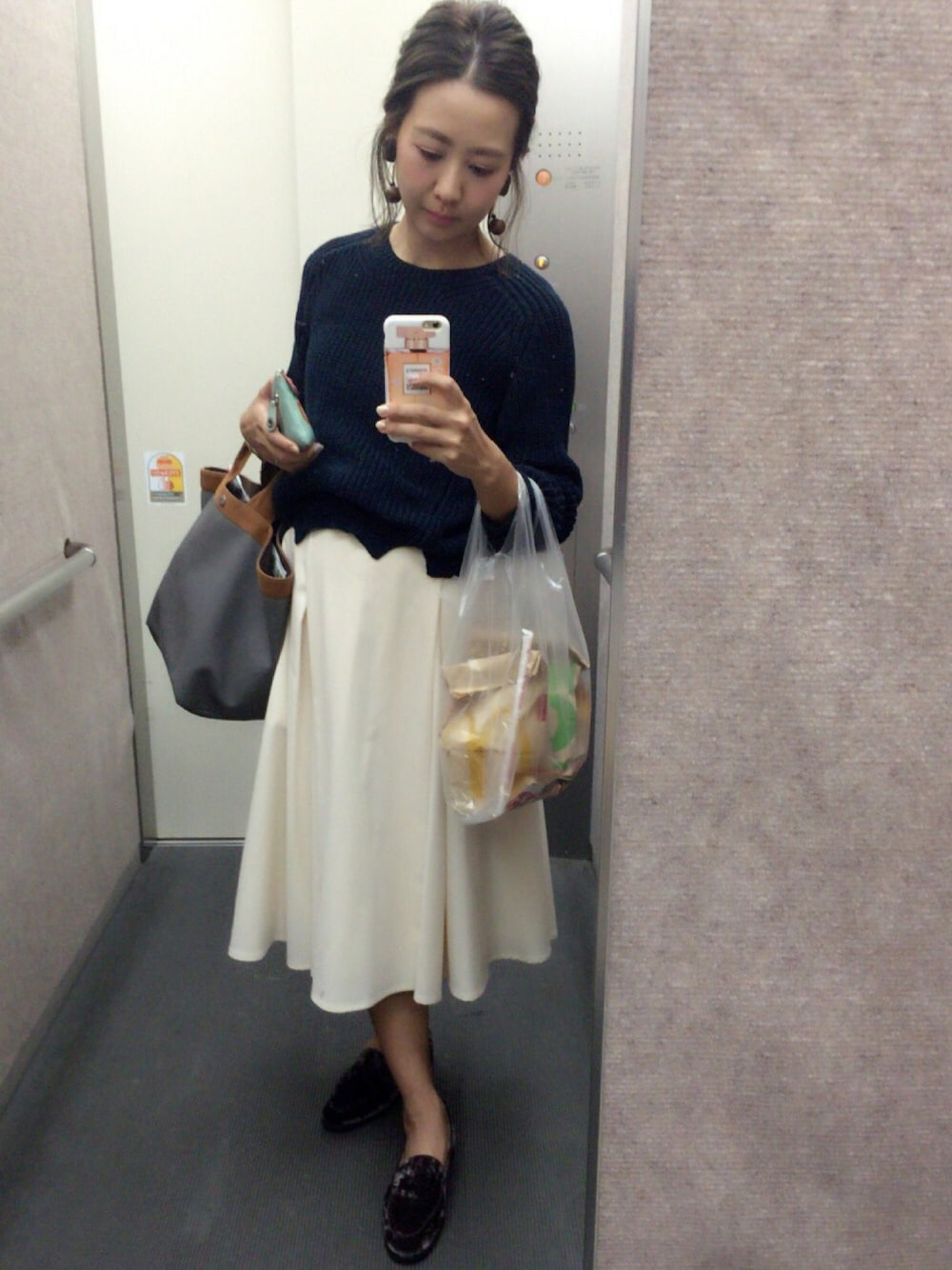 ネイビーのニット × ホワイトのフレアスカート 今日は、 ベルベットのスリッポンローファーが ポイント♡