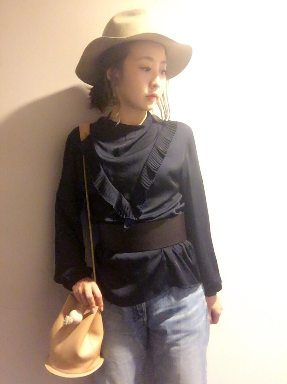 ネイビーのフリルブラウスに カットオフデニムを合わせて、 ウエストにベルトを巻いてみた😚 この合わせは2回目だけど、 合わせる帽子とバッグを変えたら 雰囲気がまた違って 見えるよね❗️