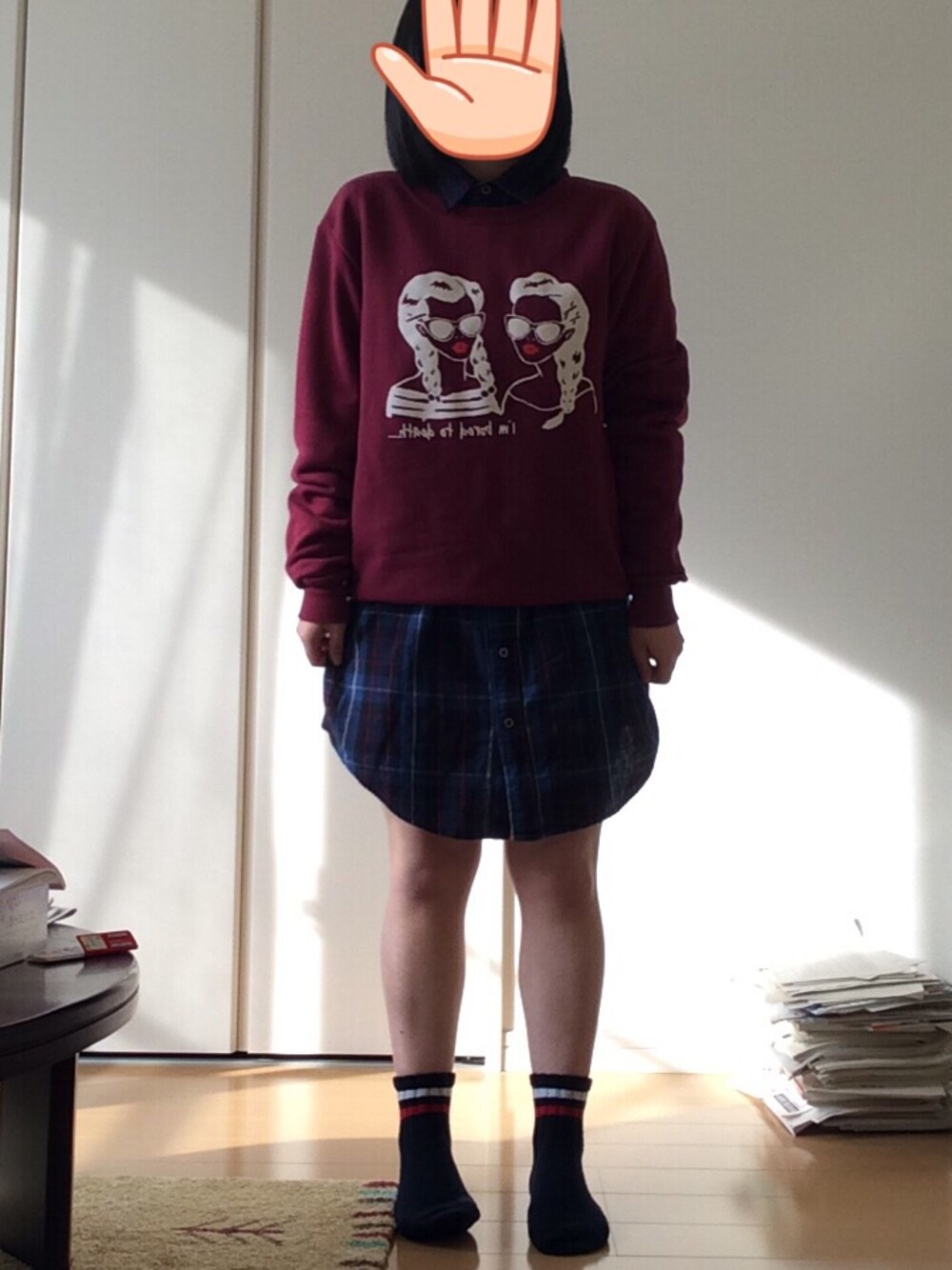 青のシャツワンピに赤のトップス 合わせてみた😀