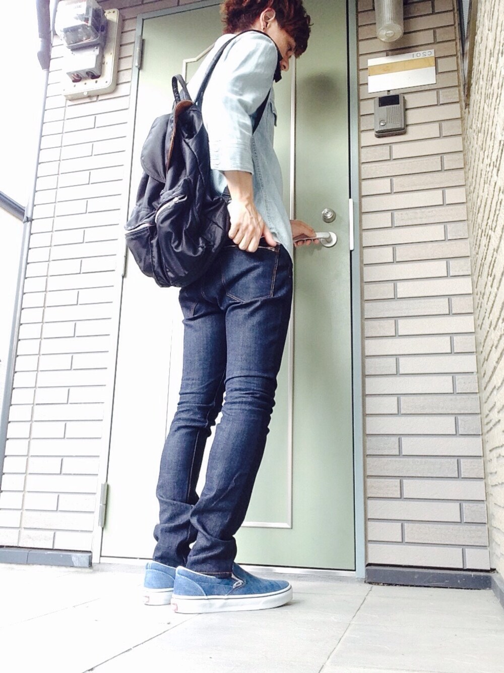 トップス(HARE) デニム(B&Y) バック(ポーター) スニーカー(VANS)