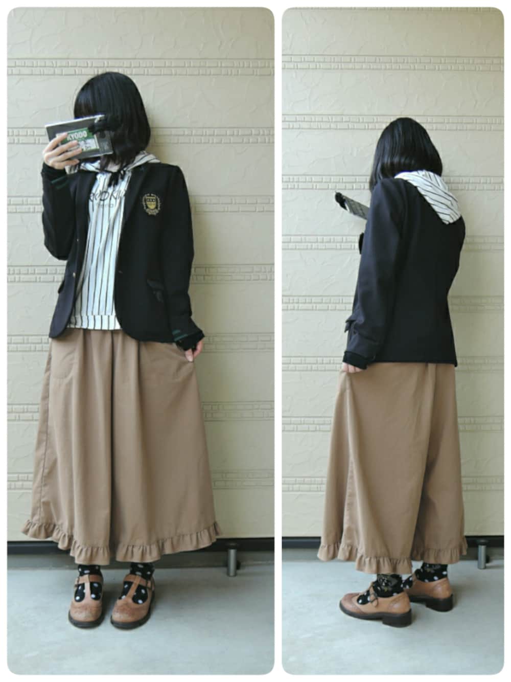 ストライプのフードつきタンクトップに ジャージっぽい素材のジャケットを着たので トップスはスポーツな感じですo 一転、ボトムスはベージュのフリルガウチョに Tストラップの革靴できれいめですo ジャケットもきれいめなのでいい感じにまとまったかなo 靴下はみずたまにゃーo にゃーショップに行ってリールパスケースみたけど 思ったより重くて要検討にしましたo