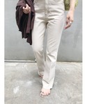 ハリ感のあるノーカラーの白シャツで ジャケットの中に着てもスッキリもたつかず◎ 裾が長めなので羽織りの下からチラッと見えるのも絶妙な長さでお気に入りポイントです♩ 後はスリットありで抜け感も◎ ジャケットは軽く羽織れるので、 気温調節としてもぴったり! サラリとした素材感です。 ベージュのフレアデニムは綺麗めな印象にも相性◎ 程よい裾フレアで足も細見えしてくれます! (デニム38サイズ着用)