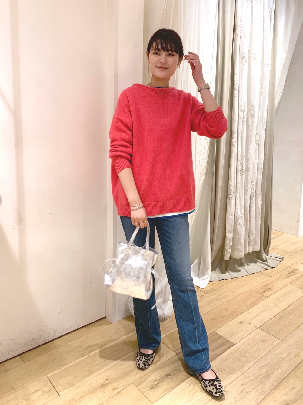 バックデザインが深いスリットになっていて、 インナーに色んなレイヤードを楽しめます! ボーダーのカットソーとデニムで 鮮やかなピンクが浮かない色合わせに! insta→yuuuu000