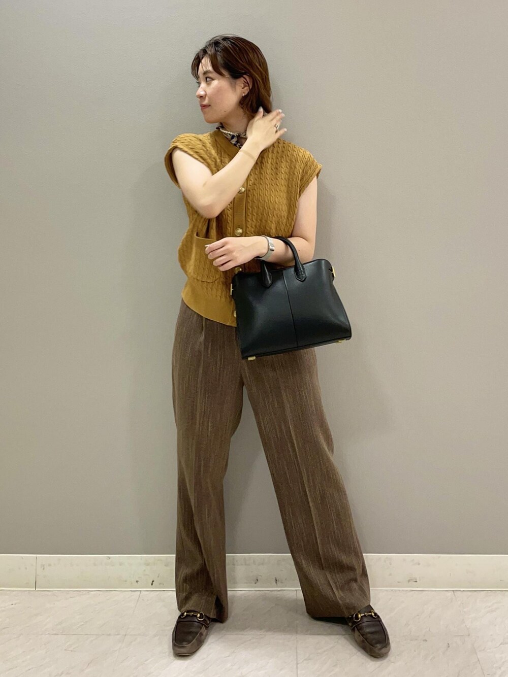 秋カラーのニットベストをメインに ツイード調のパンツやスカーフを組み合わせて 今から秋まで着れる!をイメージして コーディネートしてみました♪ ロペ定番のスカーフはパールネックレスでアレンジし 新作バックのリッチな重厚感とも相性◎ ※アクセサリー、シューズはスタッフ私物です。