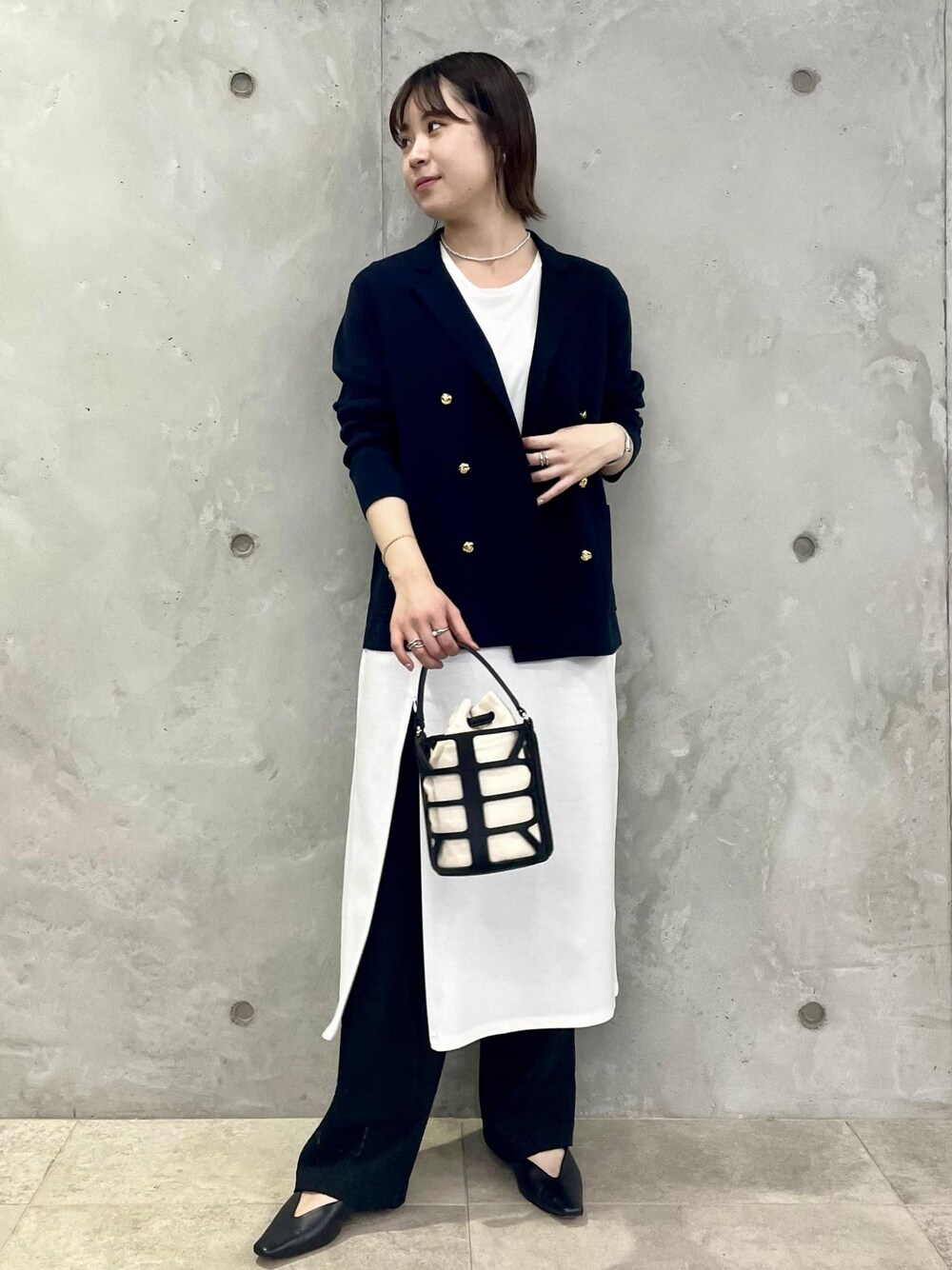 ブラックとホワイトでまとめたスタイリングです。 春夏でもブラックが重くなりすぎないように、 ジップアップのワンピースで足元の動きや パンツのヘルシーな肌見せ感 シューズも甲がでるアイテムを選び バランスをとりました!