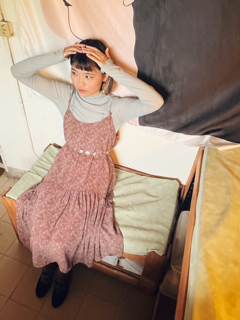 / 甲男友拍的 / 灰藍透膚內搭 :淘寶 細肩碎花連身裙:queenshop 腰鍊 :SHEIN