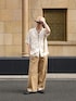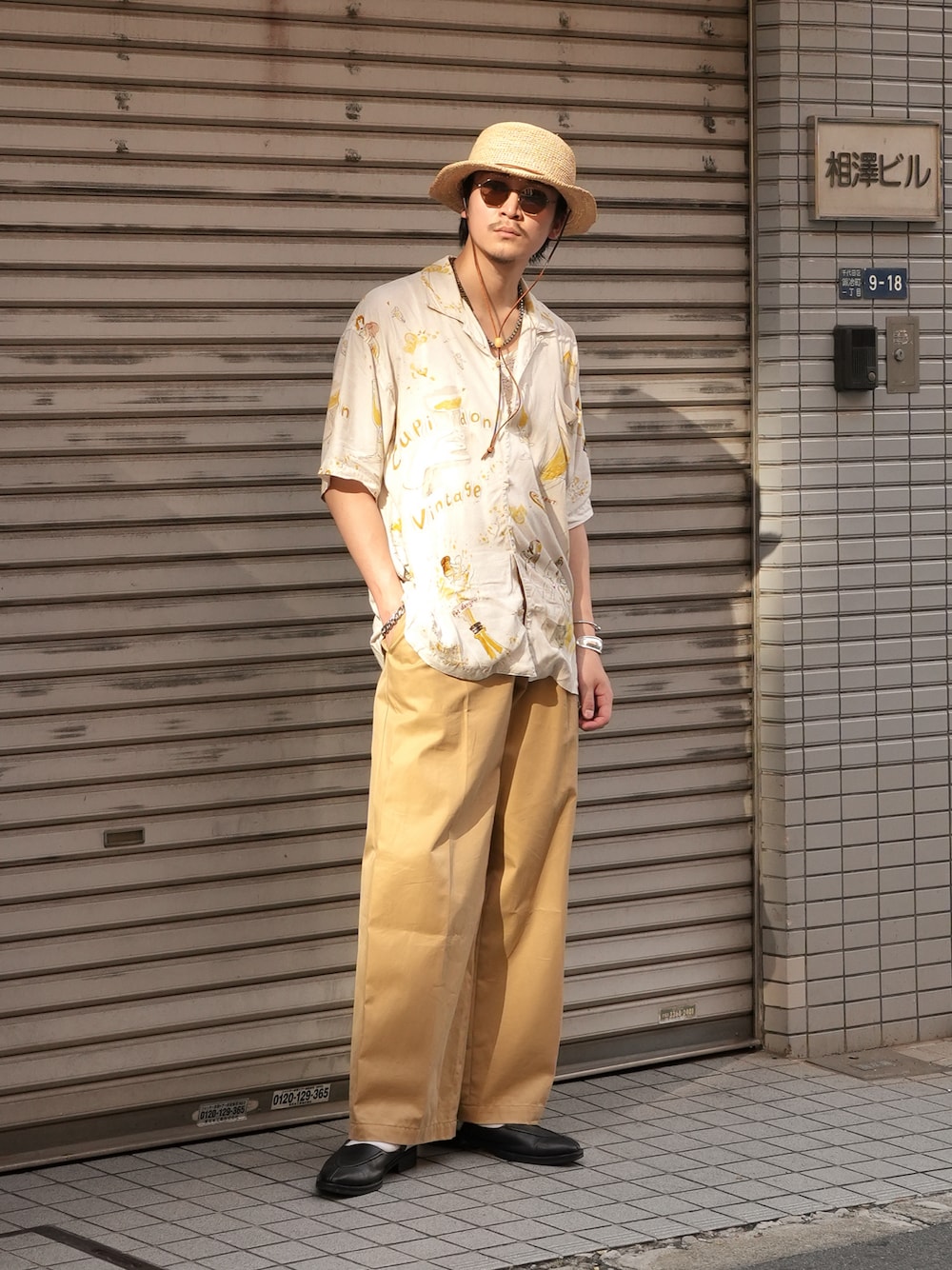 チノパンとカンカン帽で色味を合わせながら シャツのデザイン感でマイルドに仕上げてあげました◎ 香ばしい夏っぽさがあって好き🫶