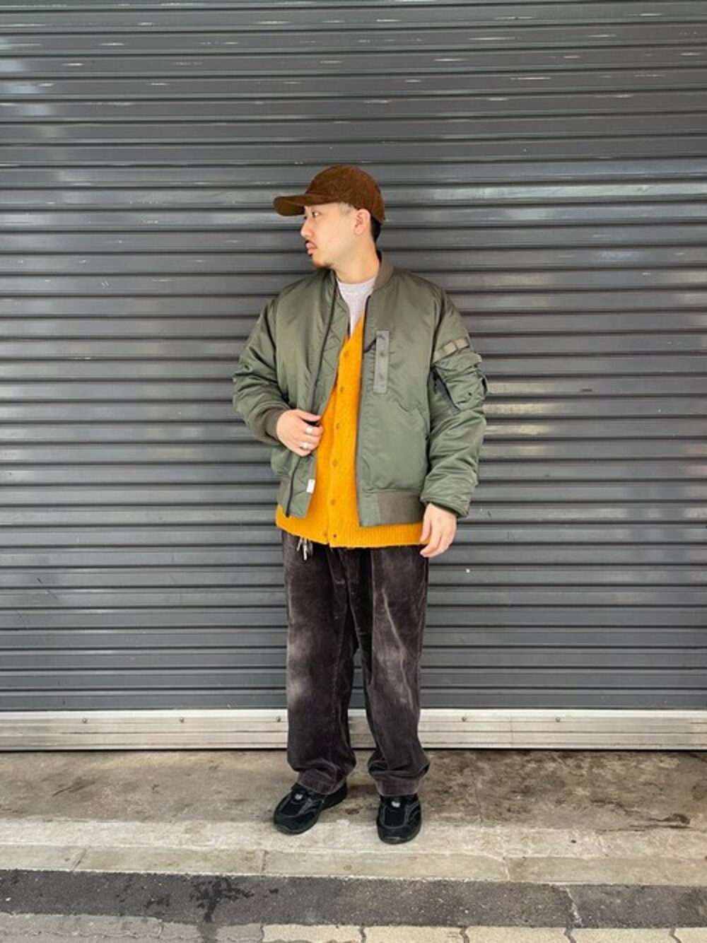 ミリタリースタイルといえば外せないのがMA-1 今回はMANASTASH×AVIREXのコラボモデルのMA-1を使ってコーディネート 丈は短めですが横幅が大きめなので重ね着スタイルがおすすめです インナーにはMANASTASHのイエローのカーディガンを合わせて差し色をプラス 【着用アイテム】 キャップ CAL O LINE・Free ジャケット MANASTASH×AVIREX・XL かなり大きめ カーディガン MANASTASH・XL 大きめ