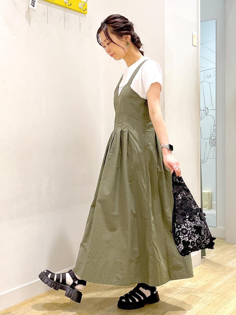 カジュアルさとかわいさが絶妙なワンピース。 今回はシンプルにTシャツ合わせにしたため 足元のボリュームやかばんにレースなど少しポイントをつけたコーディネートにしました。