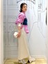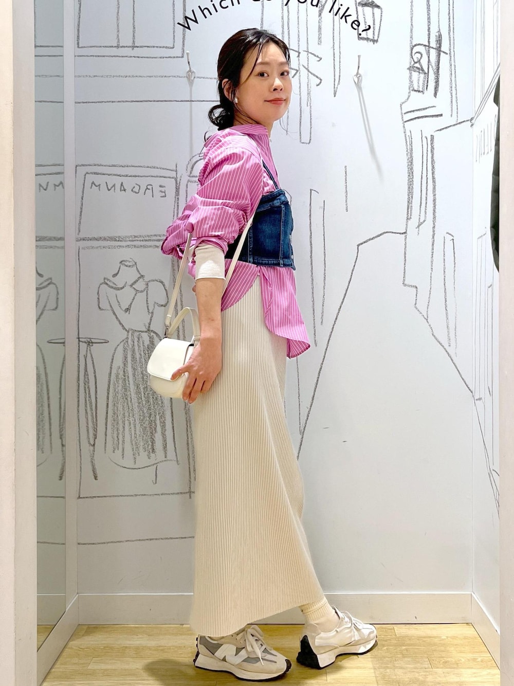 パッと華やかなピンクシャツを使ったコーデ。 今回はシャツの上にビスチェを使って 少しパンチのあるコーデにしてみました。