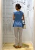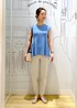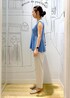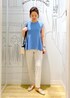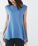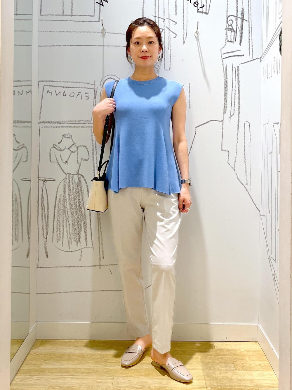 八方映えニットを使ったスタイリング。 ブルー×グレーで涼しげに。 ペプラムタイプなのでお腹が目立ちにくいです◯