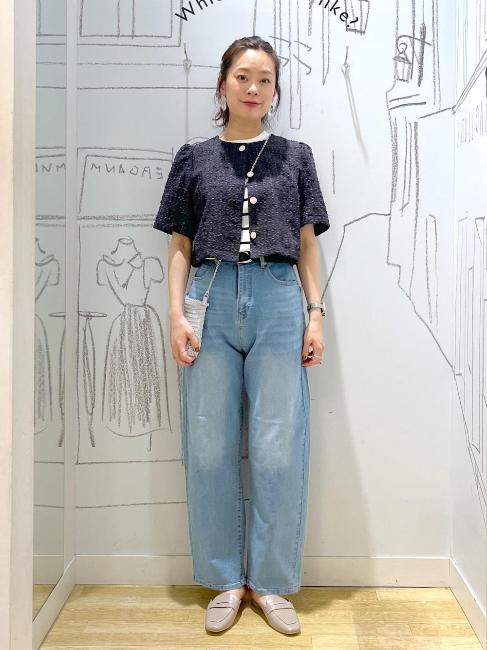 ツイードカーディガンを大人カジュアルに。 甘くなりすぎないようにデニムでカジュアルダウン。 トップスの着丈が短いので ハイウエストの革命デニムがピッタリ! 脚長効果抜群の組み合わせです◎