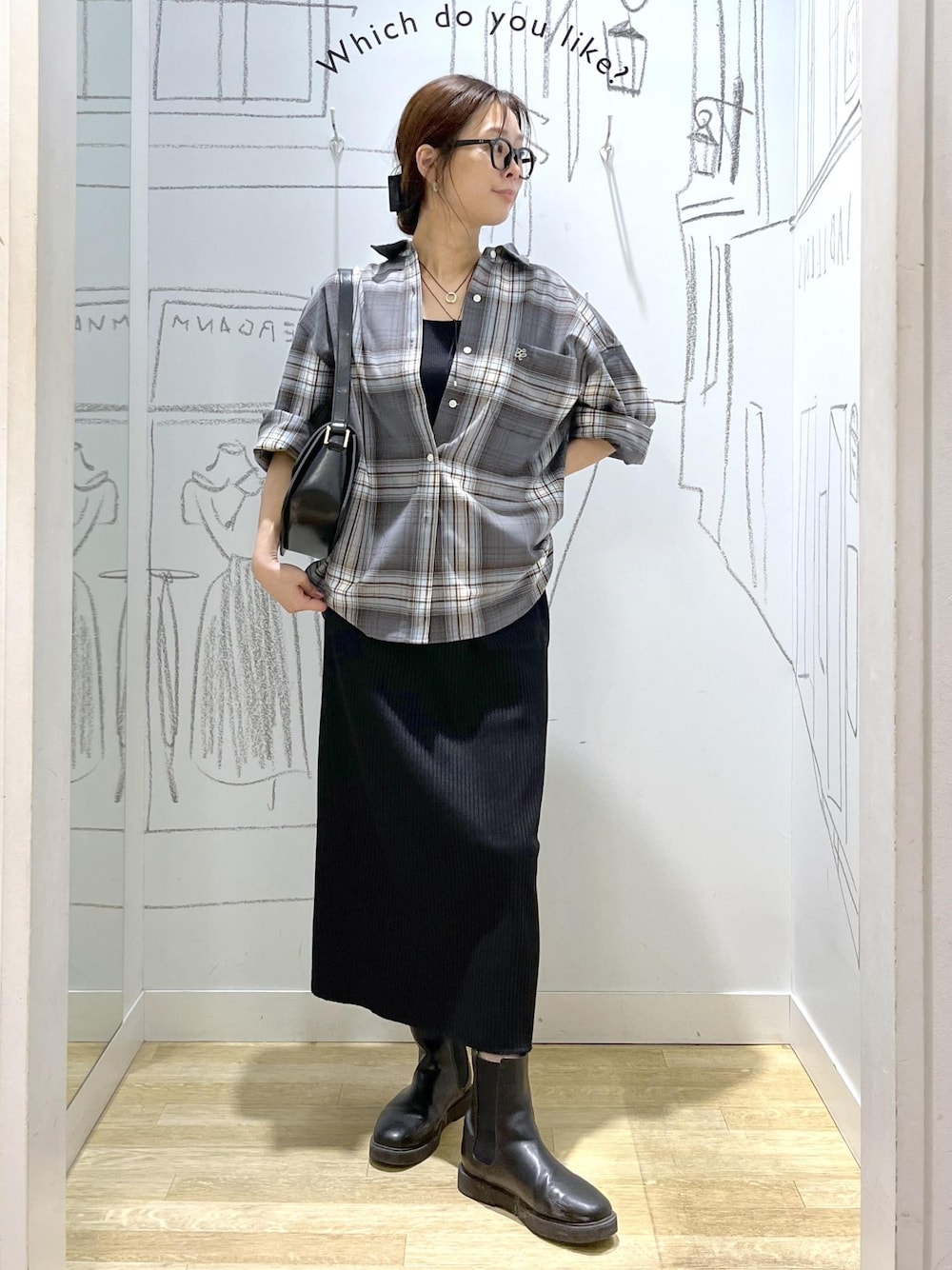 秋冬一着は持っておきたいネルシャツ。 ボタンを少し閉じてシャツを主役に! モノトーンで大人っぽくコーディネートしてみました。