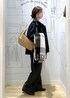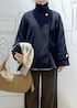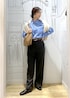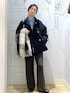 使いやすいスタンドカラーのミドル丈コートに、ブルーシャツを合わせてトラッドに。 ワイドシルエットのパンツで大人っぽさを出しつつ、ストールで季節らしいアクセントを。 通勤にも普段使いにも頼れる万能コーデです。