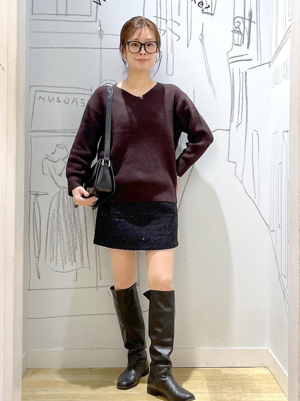 シンプルなニットに、ツイードスカートを合わせて いつもより少し「かわいい」を意識した冬コーデ。 落ち着いたカラー合わせなので、 ミニ丈でも大人っぽく取り入れられるのがポイント◎ ロングブーツを合わせて、足元はすっきり縦ラインを意識しました。 ベーシックだけど、素材で季節感を楽しめるスタイリングです。