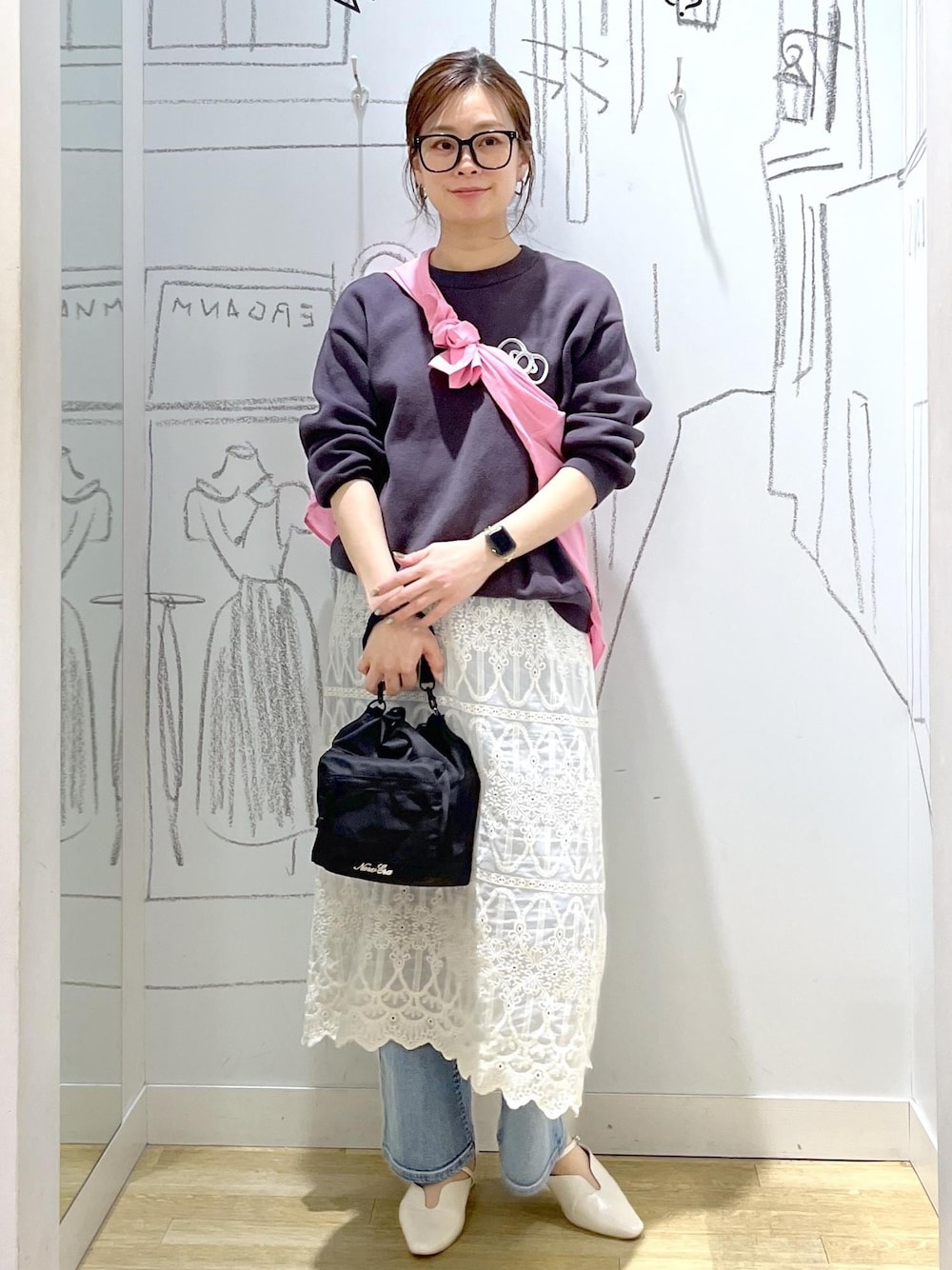 甘さを程よく引き算した大人のピンクコーデ。 カジュアルなニットに、繊細なレースを重ねて軽やかさをプラス。 ピンクの差し色で、シンプルながらも華やかさのあるスタイリングに。