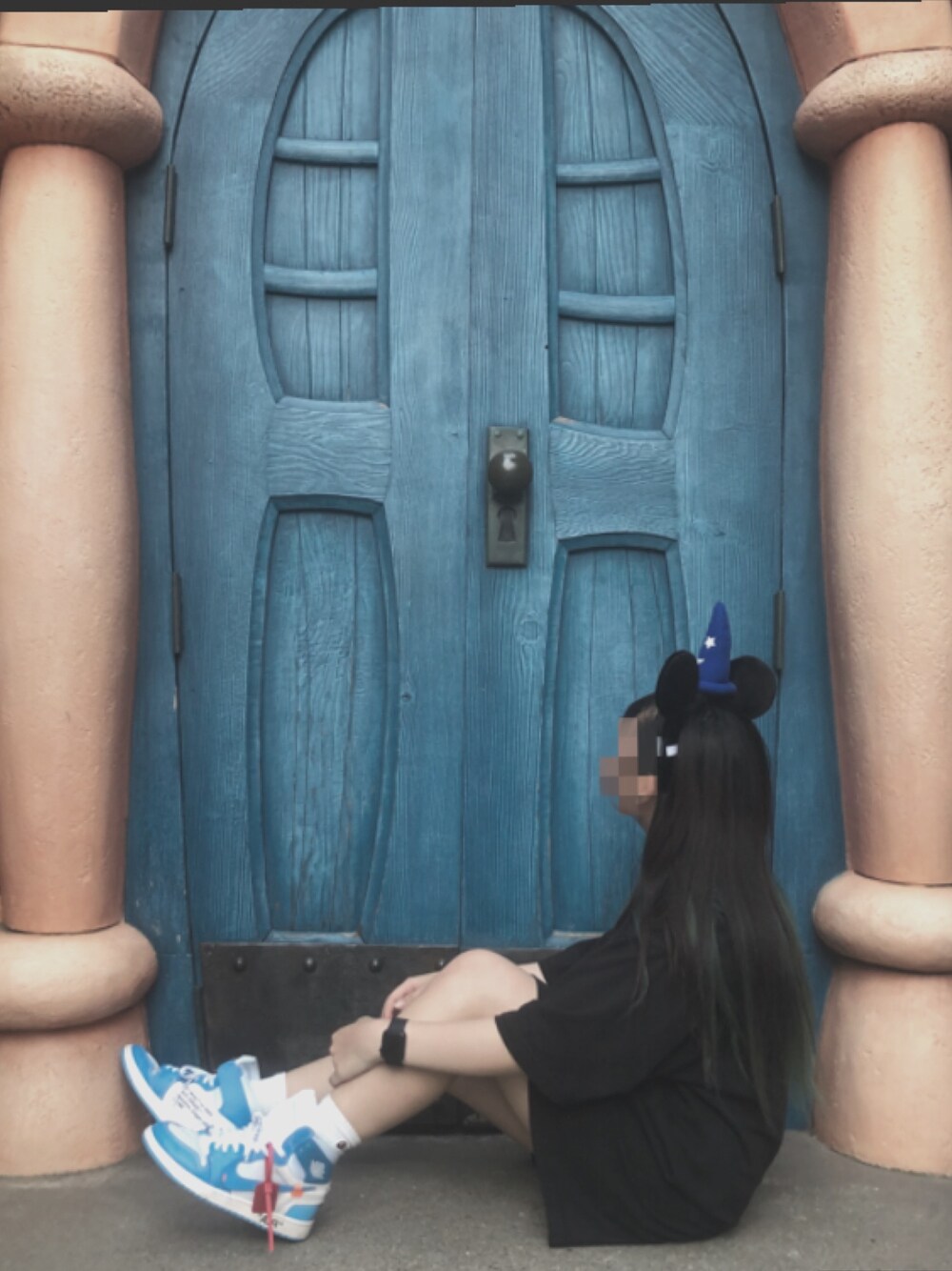 ブラック系のTシャツ/カットソー、ブルー系のスニーカーを着用したレディースの夏コーディネートの1枚目の写真