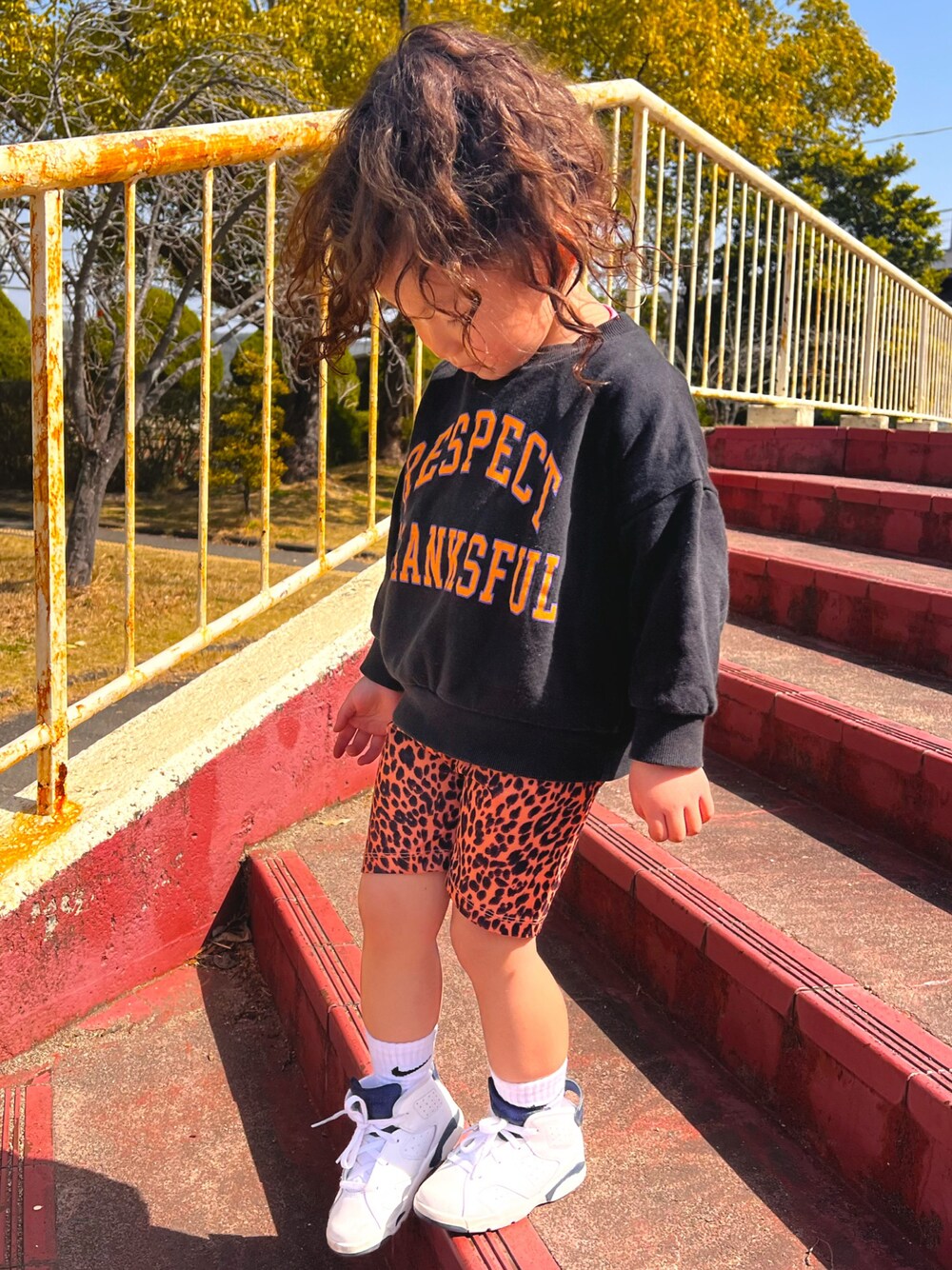 オハヨウゴザイマス🔆🤍 朝の9時30分から公園出動〰︎︎🙌🏾∗*゚ 暖かかった週末は バイカーパンツデビュー💡 ̖́- 公園に遊びに行ったんだけど 遊びやすくて♥動きやすい❗️💕 もうちょっと大きめの スウェット着せたかったケド ヒョウ柄と合うのがこれしか無かったの🥹