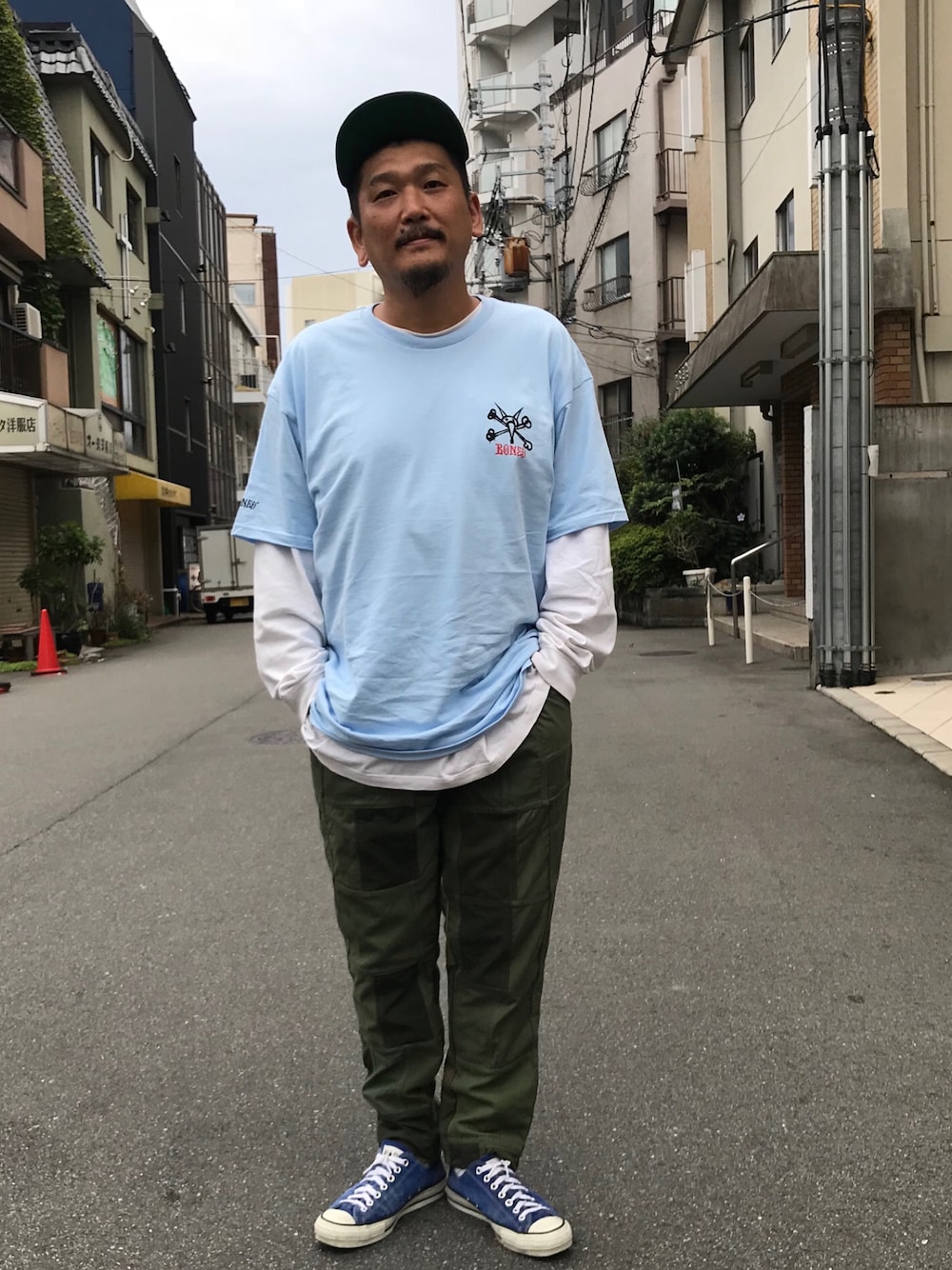 オールドスクール的な着こなし。 POWELLのTシャツ、10代の頃を思い出します。 ボトムはNasngwamのリメイクのパンツで古着っぽい雰囲気で。